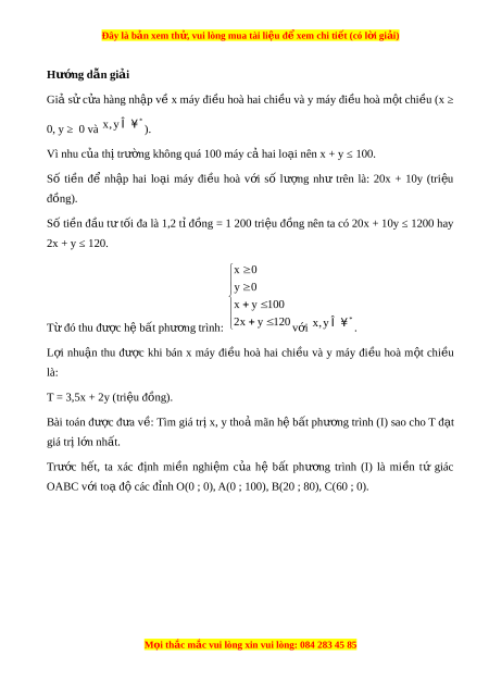 Đây là bản xem th , vu ử i lòng mua tài li u ệ đ xe ể m chi ti t ế (có l i ờ gi i ả ) Hư ng d ớ ẫn gi i ả Giả sử c a ử hàng nh p ậ v ề x máy đi u hoà ề hai chi u và ề y máy đi u ề hoà m t ộ chi u ề (x ≥ * 0, y ≥ 0 và x, y Î ¥ ). Vì nhu c a ủ th t ị rư ng không quá ờ 100 máy c hai ả lo i ạ nên x + y ≤ 100. Số ti n ề để nh p ậ hai lo i ạ máy đi u ề hoà v i ớ số lư ng