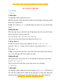 Đây là bản xem th , vu ử i lòng mua tài li u ệ đ xe ể m chi ti t ế (có l i ờ gi i ả ) Bài 2: Hoán v . ị Ch n ỉ h h p ợ A. Lý thuy t ế I. Hoán vị 1. Đ nh ng ị hĩa Cho t p ậ h p ợ A gồm n ph n t ầ ( ử n ∈ N*). Mỗi k t ế qu ả c a ủ s ự s p ắ x p ế th ứ t ự n ph n ầ t ử c a ủ t p ậ h p ợ A đư c ợ g i ọ là m t ộ hoán vị c a n ph ủ ần t đó. ử Ví d :