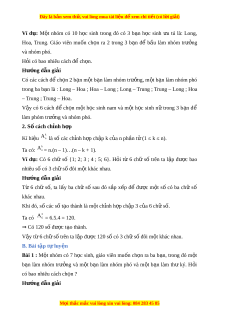 ỏ từ 6 chữ số trên ta l p ậ đư c ợ bao nhiêu số có 3 ch s ữ ố đôi m t ộ khác nhau. Hư ng d ớ ẫn gi i ả Từ 6 chữ s , ố ta l y ấ ba chữ số sau đó s p ắ x p ế để đư c ợ m t ộ số có ba chữ số khác nhau. Khi đó, số các số t o ạ thành là m t ộ ch nh h ỉ p ch ợ p ậ 3 c a 6 ch ủ s ữ . ố 3 Ta có A6 = 6.5.4 = 120. ⇒ Có 120 số đư c ợ t o t ạ hành. V y ậ t 6 ch ừ s ữ ố trên ta l p ậ đư c 120 s ợ có 3 ch ố ữ s đôi ố m t ộ khác nhau. B. Bài t p t ậ l ự uy n ệ Bài 1 : M t ộ nhóm có 7 h c ọ sinh, giáo viên mu n ố ch n ọ ra ba b n, ạ trong đó m t ộ b n ạ làm nhóm trư ng ở và m t ộ b n ạ làm nhóm phó và m t ộ b n ạ làm th ư ký. H i ỏ có bao nhiêu cách ch n ọ ? Hư ng d ớ ẫn gi i ả M i ọ thắc m c