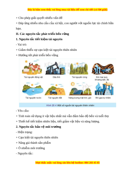 Đây là bản xem th , vu ử i lòng mua tài li u ệ đ xe ể m chi ti t (c ế ó l i ờ gi i ả ) + Cho phép gi i ả quy t ế nhi u v ề n đ ấ ề + Đáp ng ứ nhi u nhu c ề u c ầ a xã h ủ i ộ , con ngư i ờ v i ớ ngu n l ồ c t ự ài chính h u ữ h n. ạ II. Các nguyên t c p ắ hát tri n b ể n v ề ng ữ 1. Nguyên t c t ắ i t ế ki m ệ tài nguyên - Vai trò: + Gi m ả thi u ể s c ự n ạ ki t ệ tài nguyên thiên nhiên + Hư ng ớ t i ớ phát tri n b ể n ề v ng ữ - Yêu c u: ầ + Tính toán sử d ng í ụ t v t ậ li u nh ệ t ấ mà v n đ ẫ m ả b o đ ả b ộ n và t ề u i ổ thọ + Thi t ế k t ế i t ế ki m ệ nhiên li u, t ệ i t ế gi m ả v t ậ li u và năng l ệ ư ng. ợ 2. Nguyên t c b ắ o v ả m ệ ôi trư ng ờ - Hi n t ệ r ng: ạ + C n ki ạ t ệ tài nguyên thiên nhiên + Nâng giá thành s n ả ph m ẩ + Ô nhi m ễ môi trư ng ờ - Nguyên t c: ắ M i