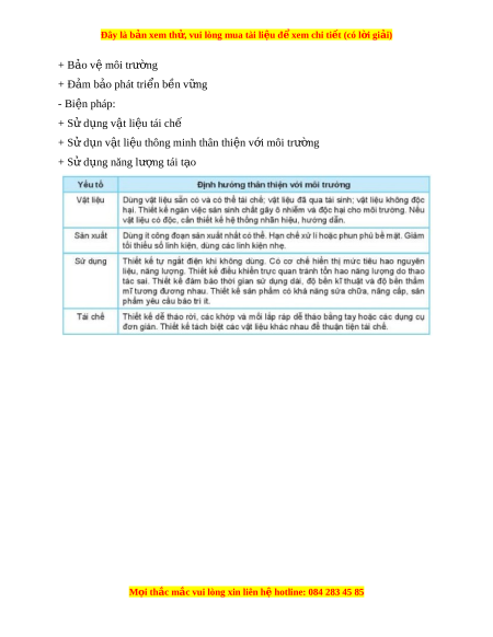 Đây là bản xem th , vu ử i lòng mua tài li u ệ đ xe ể m chi ti t (c ế ó l i ờ gi i ả ) + B o v ả m ệ ôi trư ng ờ + Đ m ả b o phát ả tri n b ể n v ề ng ữ - Bi n pháp: ệ + S d ử ng v ụ t ậ li u t ệ ái chế + S d ử n v ụ t ậ li u t ệ hông minh thân thi n v ệ i ớ môi trư ng ờ + S d ử ng năng ụ lư ng t ợ ái t o ạ M i