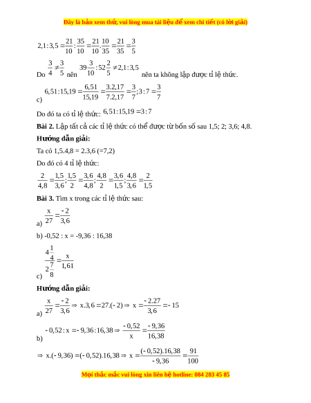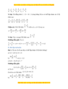 Đây là bản xem th , vu ử i lòng mua tài li u ệ đ xe ể m chi ti t (c ế ó l i ờ gi i ả ) 21 35 21 10 21 3 2,1: 3,5 : . 10 10 10 35 35 5 3 3 3 2 39 : 52 2 ,1: 3,5 Do 4 5 nên 10 5 nên ta không l p đ ậ ược tỉ l t ệ h c. ứ 6,51 3.2,17 3 3 6,51:15,19 ;3 : 7 c) 15,19 7.2,17 7 7 Do đó ta có t l ỉ t ệ h c: ứ 6,51:15,19 3 : 7 Bài 2. L p t ậ ất c các ả tỉ l t ệ h c có t ứ h đ ể ược t b ừ n s ố s ố au 1,5; 2; 3,6; 4,8. Hư ng d ớ ẫn gi i ả : Ta có 1,5.4,8 = 2.3,6 (=7,2) Do đó có 4 tỉ l t ệ h c: ứ 2 1,5 1,5 3,6 4,8 3,6 4,8 2 ; ; ; 4,8 3,6 2 4,8 2 1,5 3,6 1,5