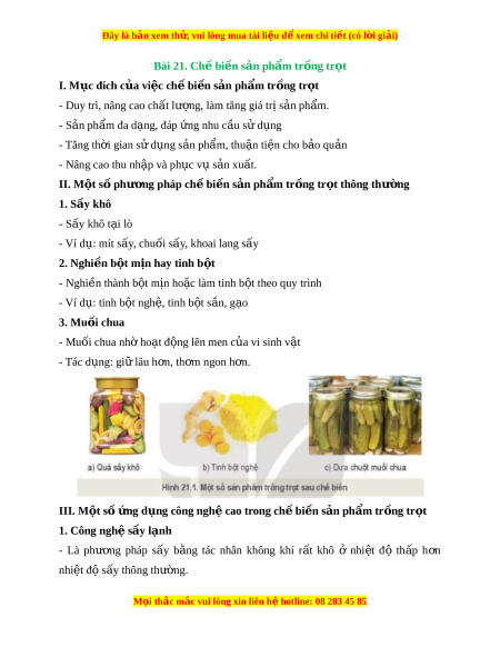 Đây là bản xem th , vu ử i lòng mua tài li u ệ đ xe ể m chi ti t (c ế ó l i ờ gi i ả ) Bài 21. Ch bi ế n s ế n ph ả m ẩ tr ng t ồ r t ọ I. M c đí ụ ch c a v ủ i c ệ ch bi ế n s ế n ả ph m ẩ tr ng ồ tr t ọ - Duy trì, nâng cao ch t ấ lư ng, l ợ àm tăng giá tr s ị n ph ả m ẩ . - S n ph ả ẩm đa d ng, ạ đáp ng nhu c ứ u s ầ d ử ng ụ - Tăng th i ờ gian sử d ng s ụ n ph ả m ẩ , thu n t ậ i n cho b ệ o qu ả n ả - Nâng cao thu nh p ậ và ph c v ụ ụ s n ả xu t ấ . II. M t ộ s ph ố ư ng pháp ch ơ b ế i n s ế n ph ả m ẩ tr ng t ồ r t ọ thông thư ng ờ 1. Sấy khô - Sấy khô t i ạ lò - Ví d : ụ mít s y ấ , chu i ố s y ấ , khoai lang s y ấ 2. Nghi n b ề t ộ m n hay t ị inh b t ộ - Nghi n t ề hành b t ộ m n ho ị c ặ làm tinh b t ộ theo quy trình - Ví d : ụ tinh b t ộ ngh , t ệ inh b t ộ s n, g ắ o ạ 3. Mu i ố chua - Muối chua nhờ ho t ạ đ ng l ộ ên men c a ủ vi sinh v t ậ - Tác d ng: ụ gi l ữ âu h n, ơ th m ơ ngon h n. ơ III. M t ộ số ng d ứ ng công ngh ụ cao t ệ rong ch bi ế n s ế n p ả h m ẩ tr ng ồ tr t ọ 1. Công ngh s ệ ấy lạnh - Là phư ng ơ pháp s y ấ b ng ằ tác nhân không khí r t ấ khô ở nhi t ệ độ th p ấ h n ơ nhiệt đ s ộ ấy thông thư ng. ờ M i