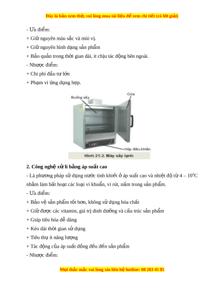 Đây là bản xem th , vu ử i lòng mua tài li u ệ đ xe ể m chi ti t (c ế ó l i ờ gi i ả ) - u đi Ư m ể : + Gi nguyên ữ màu s c ắ và mùi v .ị + Gi nguyên ữ hình d ng ạ s n ả ph m ẩ + B o qu ả n ả trong th i ờ gian dài, ít ch u t ị ác đ ng ộ bên ngoài. - Như c ợ đi m ể : + Chi phí đ u t ầ l ư n ớ + Ph m ạ vi ng ứ d ng h ụ p. ẹ 2. Công ngh x ệ l ử í b ng áp s ằ u t ấ cao - Là phư ng ơ pháp s ử d ng ụ nư c ớ tinh khi t ế ở áp su t ấ cao và nhi t ệ đ ộ t ừ 4 – 100C nh m ằ làm bất ho t ạ các lo i ạ vi khu n, vi ẩ rút, n m ấ trong s n ả ph m ẩ . - u đi Ư m ể : + B o v ả s ệ n ả ph m ẩ t t ố h n, không s ơ d ử ng hóa ch ụ t ấ + Gi đ ữ ư c ợ các vitamin, giá tr di ị nh dư ng và c ỡ u t ấ rúc s n ả ph m ẩ + Giúp tiêu hóa dễ dàng + Kéo dài th i ờ gian s d ử ng ụ + Tiêu th í ụ t năng lư ng ợ + Tác đ ng c ộ a áp s ủ u t ấ đ ng đ ồ u đ ề n ế s n ả ph m ẩ - Như c ợ đi m ể : M i