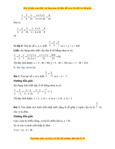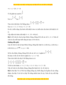 ợ x = 2 . (-1) = -2 và y = (-5) . (-1) = 5 2 Bài 2. Tìm di n ệ tích hình chữ nh t ậ bi t ế r ng ằ tỉ số gi a ữ 2 c nh ạ c a ủ nó là 5 và chu vi là 28m. Hư ng d ớ ẫn gi i ả : G i ọ x (m) là chi u r ề ng, y ( ộ m) là chi u dài ề (x, y > 0) Ta có chu vi hình chữ nh t ậ là 28m ⇒ (x + y) . 2 = 28 M i