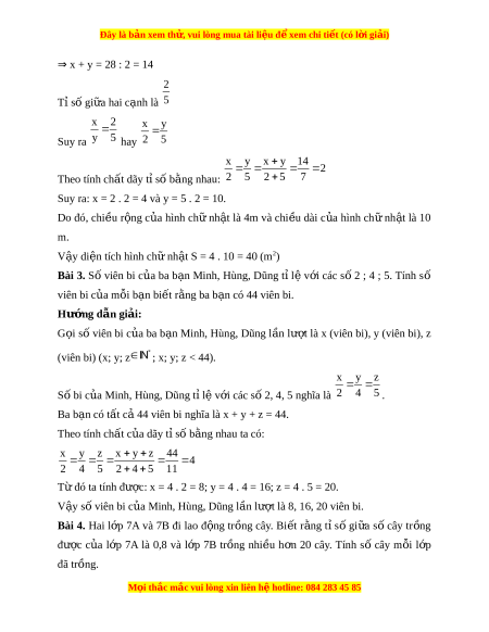 Đây là bản xem th , vu ử i lòng mua tài li u ệ đ xe ể m chi ti t (c ế ó l i ờ gi i ả ) ⇒ x + y = 28 : 2 = 14 2 Tỉ số gi a hai ữ c nh ạ là 5 x 2 x y Suy ra y 5 hay 2 5 x y x y 14 2 Theo tính ch t ấ dãy t s ỉ ố b ng nhau: ằ 2 5 2 5 7