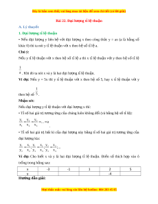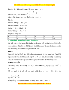 ớ x = -1 thì y = (-2).(-1) =2 V i ớ x = 1 thì y = (-2).1 = -2 V i ớ x= 5 thì y = (-2).5 = -10 V y ậ ta có b ng ả sau: x -3 -1 1 2 5 y 6 2 -2 -4 -10 2. M t ộ s bài ố toán v đ ề i ạ lư ng t ợ l ỉ t ệ hu n ậ Để gi i ả toán về đ i ạ lư ng ợ t l ỉ t ệ hu n, ậ ta c n nh ầ n ậ bi t ế hai đ i ạ lư ng ợ t l ỉ t ệ hu n ậ