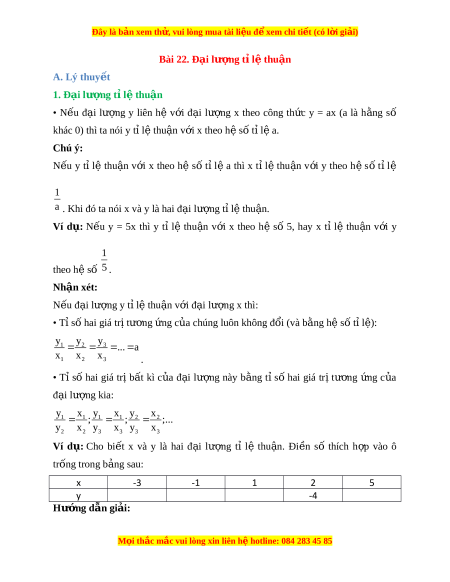 Bài 22. Đại lư ng t ợ l ỉ t ệ hu n ậ A. Lý thuy t ế 1. Đại lư ng t ợ l ỉ t ệ hu n ậ • N u ế đ i ạ lư ng ợ y liên hệ v i ớ đ i ạ lư ng ợ x theo công th c ứ y = ax (a là h ng ằ số khác 0) thì ta nói y t l ỉ t ệ hu n ậ v i ớ x theo h s ệ t ố l ỉ a. ệ Chú ý: N u ế y tỉ lệ thu n ậ v i ớ x theo hệ số tỉ l ệ a thì x t ỉl ệ thu n ậ v i ớ y theo h ệ s ố t ỉlệ 1