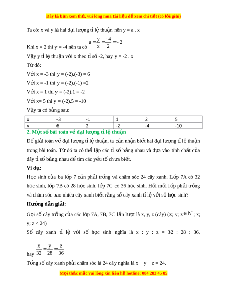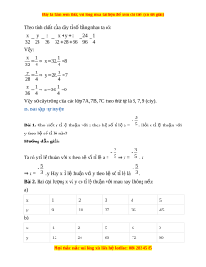 Đây là bản xem th , vu ử i lòng mua tài li u ệ đ xe ể m chi ti t (c ế ó l i ờ gi i ả ) Theo tính ch t ấ c a dãy t ủ s ỉ b ố ng ằ nhau ta có: x y z x y z 24 1 32 28 36 32 28 36 96 4 V y: ậ x 1 1 x 32 . 8 32 4 4 y 1 1 y 28. 7 28 4 4 z 1 1 z 36. 9 36 4 4 V y ậ số cây trồng c a các ủ l p 7A ớ , 7B, 7C theo th t ứ l ự à 8, 7, 9 (cây). B. Bài t p t ậ l ự uy n ệ 3 Bài 1. Cho bi t ế y tỉ l ệ thu n ậ v i ớ x theo h ệ s ố t ỉl ệ a = 5 . H i ỏ x tỉ l ệ thu n ậ v i ớ y theo hệ số tỉ l nào? ệ Hư ng d ớ ẫn gi i ả : 3 3 Ta có y tỉ lệ thu n v ậ i ớ x theo h s ệ ố t l ỉ ệ a = 5 ⇒ y = 5 . x 5 5