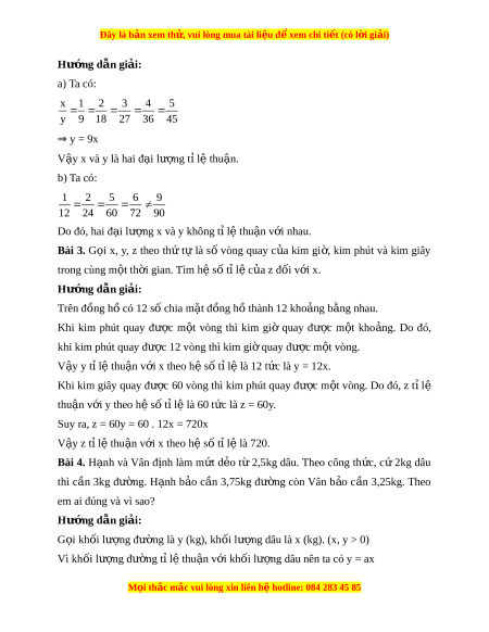 Đây là bản xem th , vu ử i lòng mua tài li u ệ đ xe ể m chi ti t (c ế ó l i ờ gi i ả ) Hư ng d ớ ẫn gi i ả : a) Ta có: x 1 2 3 4 5 y 9 18 27 36 45 ⇒ y = 9x V y ậ x và y là hai đ i ạ lư ng t ợ l ỉ t ệ hu n. ậ b) Ta có: 1 2 5 6 9 12 24 60 72 90 Do đó, hai đ i ạ lư ng x và y không t ợ ỉ l t ệ hu n v ậ i ớ nhau. Bài 3. G i