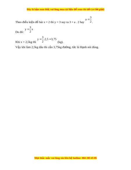 ừ 2,5kg dâu. Theo công th c, ứ c ứ 2kg dâu thì c n ầ 3kg đư ng. ờ H nh ạ b o ả c n ầ 3,75kg đư ng ờ còn Vân b o ả c n ầ 3,25kg. Theo em ai đúng và vì sao? Hư ng d ớ ẫn gi i ả : G i ọ khối lư ng đ ợ ư ng ờ là y (kg), kh i ố lư ng dâu l ợ à x (kg). (x, y > 0) Vì khối lư ng đ ợ ư ng ờ t l ỉ t ệ hu n v ậ i ớ kh i ố lư ng ợ dâu nên ta có y = ax M i