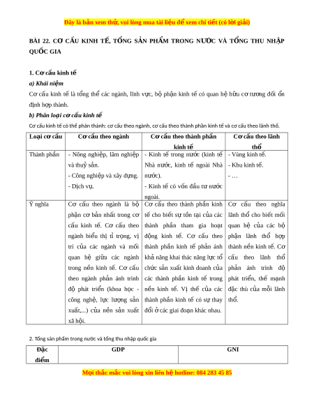 Đây là bản xem th , vu ử i lòng mua tài li u ệ đ xe ể m chi ti t ế (có l i ờ gi i ả ) BÀI 22. CƠ C U Ấ KINH T , Ế T N Ổ G S N Ả PH M Ẩ TRONG NƯ C Ớ VÀ T N Ổ G THU NH P Ậ QU C Ố GIA 1. C c ơ ấu kinh tế a) Khái ni m ệ Cơ cấu kinh tế là t ng