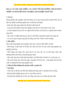 ế khác, kích thích các ngành kinh t ế khác phát tri n. ể - S n xu ả ất ra nh ng m ữ t ặ hàng có giá tr xu ị t ấ kh u, t ẩ ăng thêm ngu n t ồ hu ngo i ạ t . ệ - Có vai trò quan tr ng t ọ rong gi cân ữ b ng s ằ inh thái và b o v ả m ệ ôi trư ng. ờ 2. Đặc đi m ể S n ả xu t ấ nông nghi p, l ệ âm nghi p, t ệ hu s ỷ n ả có m t ộ s đ ố c ặ đi m ể c b ơ n: ả - Đ t ấ tr ng ồ và m t ặ nư c ớ là tư li u ệ s n ả xu t ấ ch ủ y u ế c a ủ s n ả xu t ấ nông nghi p, ệ lâm nghiệp, thu s ỷ n. ả - Đối tư ng ợ c a ủ nông, lâm, thuỷ s n ả là các sinh v t ậ , các cơ thể s ng. ố S n ả xu t ấ thư ng ờ đư c t ợ i n hành t ế rong không gian r ng. ộ - S n xu ả ất nông, lâm, thu s ỷ n ả ph t ụ hu c vào ộ đi u ề ki n t ệ nhi ự ên và có tính mùa v . ụ - S n ả xu t ấ nông, lâm, thu ỷ s n ả ngày càng g n ắ v i ớ khoa h c ọ - công ngh , ệ liên k t ế s n ả xuất và hư ng ớ t i ớ n n nông nghi ề p xanh. ệ 3. Nhân t ố n ả h hư ng t ở i ớ s phát ự tri n và phân b ể ố * Tự nhiên - Tính ch t ấ và đ phì ộ c a đ ủ t ấ nh ả hư ng t ở i ớ năng su t ấ và s phân b ự cây t ố r ng. ồ - Địa hình nh h ả ư ng ở t i ớ quy mô và cách th c ứ canh tác. - Khí h u ậ nh ả hư ng t ở i ớ cơ c u cây t ấ r ng, t ồ ính mùa v và hi ụ u qu ệ s ả n ả xu t ấ . M i