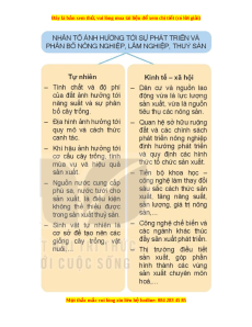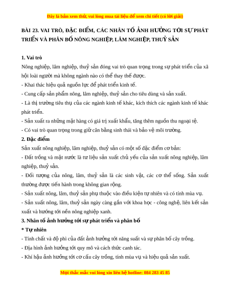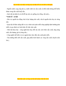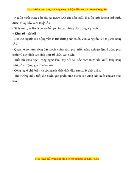 Đây là bản xem th , vu ử i lòng mua tài li u ệ đ xe ể m chi ti t ế (có l i ờ gi i ả ) - Ngu n ồ nư c ớ cung c p ấ phù sa, nư c ớ tư i ớ cho s n ả xu t ấ , là đi u ề ki n ệ không th ể thi u ế đư c ợ trong s n ả xu t ấ thu s ỷ n. ả - Sinh v t ậ t nhi ự ên là c s ơ đ ở ể t o nên các ạ gi ng cây ố tr ng, v ồ t ậ nuôi,... * Kinh t - ế xã h i ộ - Dân c , ư ngu n ồ lao đ ng ộ v a ừ là l c ự lư ng ợ s n ả xu t ấ , v a ừ là ngu n ồ tiêu th ụ các nông s n. ả - Quan h ệ s ở h u ữ ru ng ộ đ t