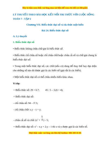 Ọ KẾT NỐI TRI TH C Ứ V I Ớ CU C Ộ S N Ố G TOÁN 7 - TẬP 2 Chư ng ơ VII. Bi u t ể h c đ ứ i ạ s và đa t ố h c m ứ t ộ bi n ế Bài 24. Bi u t ể h c đ ứ i ạ số A. Lý thuy t ế 1. Bi u ể th c đ ứ ại số • Bi u ể th c không ch ứ a ứ ch g ữ i ọ là bi u t ể h c ứ số. • Bi u ể th c ứ ch ỉch a ứ s ố ho c ặ ch ch ỉ a ứ ch ho ữ c ặ ch a ứ c s ả và ố ch ữ g i ọ chung là bi u t ể h c ứ đ i ạ số. • Trong m t ộ bi u ể th c ứ đ i ạ s , ố các chữ (n u