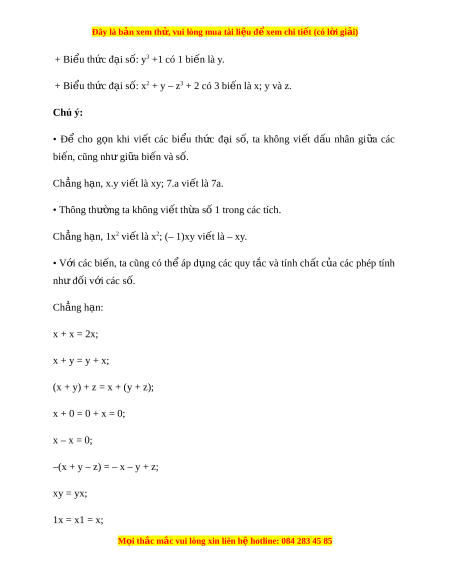 ố x2 + y – z3 + 2 có 3 bi n l ế à x; y và z. Chú ý: • Để cho g n ọ khi vi t ế các bi u ể th c ứ đ i ạ s , ố ta không vi t ế d u ấ nhân gi a ữ các bi n, cũng ế nh gi ư a bi ữ n và s ế ố. Ch ng h ẳ n, ạ x.y vi t ế là xy; 7.a vi t ế là 7a. • Thông thư ng ờ ta không vi t ế th a s ừ ố 1 trong các tích. Ch ng h ẳ n, ạ 1x2 vi t ế là x2; (– 1)xy vi t ế là – xy. • V i ớ các bi n, ế ta cũng có th áp ể d ng ụ các quy t c ắ và tính ch t ấ c a ủ các phép tính nh đ ư ối v i ớ các s . ố Ch ng h ẳ n: ạ x + x = 2x; x + y = y + x; (x + y) + z = x + (y + z); x + 0 = 0 + x = 0; x – x = 0;