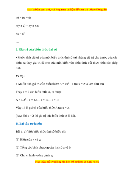 Đây là bản xem th , vu ử i lòng mua tài li u ệ đ xe ể m chi ti t (c ế ó l i ờ gi i ả ) x0 = 0x = 0; x(y ± z) = xy ± xz; xx = x2; … 2. Giá tr c ị a bi ủ u t ể h c đ ứ i ạ số • Muốn tính giá tr ị c a ủ m t ộ bi u ể th c ứ đ i ạ s ố t i ạ nh ng ữ giá tr ịcho trư c ớ c a ủ các bi n,