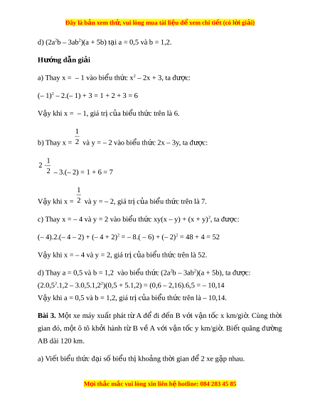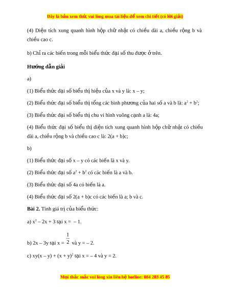 Đây là bản xem th , vu ử i lòng mua tài li u ệ đ xe ể m chi ti t (c ế ó l i ờ gi i ả ) (4) Di n ệ tích xung quanh hình h p ộ chữ nh t ậ có chi u ề dài a, chi u ề r ng ộ b và chi u ề cao c. b) Ch r ỉ a các bi n t ế rong m i ỗ bi u t ể h c ứ đ i ạ s t ố hu đư c ợ t ở rên. Hư ng d ớ ẫn gi i ả a) (1) Bi u ể th c đ ứ i ạ s bi ố u t ể h h ị i u c ệ a ủ x và y là: x – y; (2) Bi u ể th c đ ứ i ạ s bi ố u t ể h t ị ng các ổ bình phư ng c ơ a hai ủ s a và b l ố à: a2 + b2; (3) Bi u ể th c đ ứ i ạ s bi ố u t ể h chu vi ị hình vuông c nh a l ạ à: 4a; (4) Bi u ể th c ứ đ i ạ số bi u ể thị di n ệ tích xung quanh hình h p ộ chữ nh t ậ có chi u ề dài a, chi u r ề ng b và chi ộ u cao c ề là: 2(a + b)c; b) (1) Bi u ể th c đ ứ i ạ s x – y có các bi ố n ế là x và y. (2) Bi u ể th c đ ứ i ạ s a ố 2 + b2 có các bi n ế là a và b. (3) Bi u ể th c đ ứ i ạ s 4a có bi ố n l ế à a. (4) Bi u ể th c đ ứ i ạ s 2 ố (a + b)c có các bi n l ế à a; b và c. Bài 2. Tính giá tr c ị a bi ủ u t ể h c: ứ a) x2 – 2x + 3 t i ạ x = – 1. 1 b) 2x – 3y t i ạ x = 2 và y = – 2. c) xy(x – y) + (x + y)2 t i ạ x = – 4 và y = 2. M i