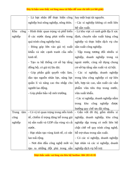 nghiệp hoá nông nghiệp, nông thôn. - Các xí nghi p ệ không có m i ố liên hệ s n ả xu t ấ . Khu công - Hình th c ứ quan tr ng ọ và phổ bi n ế - Là khu v c ự có ranh gi i ớ đ a ị lí xác nghiệp ở các nư c ớ đang phát tri n ể trong định, chuyên s n ả xu t ấ hàng công quá trình công nghi p hoá. ệ nghiệp và th c ự hi n ệ d ch ị vụ cho - Đóng góp l n ớ vào giá trị xu t ấ s n ả xu t ấ công nghi p. ệ khẩu và s c ứ c nh ạ tranh c a ủ n n ề - T p ậ trung tư ng ơ đ i ố nhi u ề xí kinh t . ế nghiệp, doanh nghi p ệ trong và - T o ạ ra hệ th ng ố cơ sở hạ t ng ầ ngoài nư c, ớ cùng sử d ng ụ chung đồng b , ộ có giá tr l ị âu dài. c s ơ ở h t ạ ầng s n ả xuất và xã h i ộ . - Góp ph n ầ gi i ả quy t ế vi c ệ làm, - Các xí nghi p, ệ doanh nghi p ệ đào t o ạ ngu n ồ nhân l c, ự năng l c ự trong khu công nghi p ệ có sự liên qu n ả lí và nâng cao thu nh p ậ cho k t ế , h p ợ tác cao, s n ả xu t ấ các s n ả ngư i ờ lao đ ng. ộ ph m ẩ v a ừ tiêu thụ trong nư c, ớ - Góp phần b o ả v m ệ ôi trư ng. ờ v a xu ừ ất kh u. ẩ - Các xí nghi p, ệ doanh nghi p ệ n m ằ trong khu công nghi p ệ đư c ợ hư ng quy ch ở ế u đãi ư riêng. Trung tâm - Có v ị trí quan tr ng ọ trong n n ề kinh - G n ắ v i ớ đô th ,ị g m ồ nhi u ề xí công t , ế chi m ế tỉ tr ng