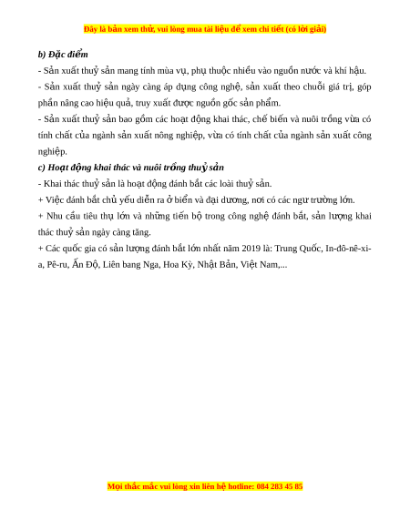 Đây là bản xem th , vu ử i lòng mua tài li u ệ đ xe ể m chi ti t ế (có l i ờ gi i ả ) b) Đặc đi m ể - S n xu ả ất thu s ỷ n ả mang tính mùa v , ph ụ t ụ hu c ộ nhi u ề vào ngu n n ồ ư c ớ và khí h u. ậ - S n ả xu t ấ thuỷ s n ả ngày càng áp d ng ụ công ngh , ệ s n ả xu t ấ theo chu i ỗ giá tr ,ị góp phần nâng cao hi u qu ệ , ả truy xu t ấ đư c ợ ngu n g ồ c s ố n ả ph m ẩ . - S n ả xu t ấ thuỷ s n ả bao g m ồ các ho t ạ đ ng ộ khai thác, ch ế bi n ế và nuôi tr ng ồ v a ừ có tính ch t ấ c a ủ ngành s n ả xu t ấ nông nghi p, ệ v a ừ có tính ch t ấ c a ủ ngành s n ả xu t ấ công nghiệp.