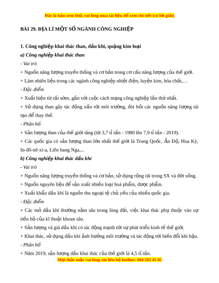 Đây là bản xem th , vu ử i lòng mua tài li u ệ đ xe ể m chi ti t ế (có l i ờ gi i ả ) BÀI 29. Đ A Ị LÍ M T Ộ S N Ố GÀNH CÔNG NGHI P Ệ 1. Công nghi p k ệ hai thác than, d u k ầ hí, qu ng ki ặ m lo i ạ