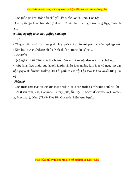 ớ quá trình công nghi p hoá. ệ + Kim lo i ạ đư c ợ sử d ng nhi ụ u ề các ở thi t ế b t ị rong đ i ờ s ng,... ố - Đ c ặ đi m ể + Qu ng ặ kim lo i ạ đư c ợ chia thành m t ộ s nhóm ố : kim lo i ạ đen, màu, quý, hi m ế ,... + Vi c ệ khai thác thi u ế quy ho ch ạ khi n ế nhi u ề lo i ạ qu ng ặ kim lo i ạ có nguy cơ c n ạ kiệt, gây ô nhi m ễ môi trư ng, ờ đòi h i ỏ ph i ả có các v t ậ li u ệ thay th ế và tái s d ử ng ụ kim lo i ạ . - Phân bố + Các nư c ớ khai thác qu ng ki ặ m lo i ạ nhi u ề đ u l ề à các nư c ớ có tr l ữ ư ng qu ợ ng ặ l n. ớ + S t