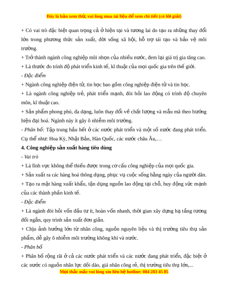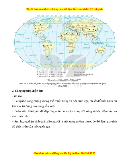 Đây là bản xem th , vu ử i lòng mua tài li u ệ đ xe ể m chi ti t ế (có l i ờ gi i ả ) 2. Công nghi p đ ệ i n l ệ c ự - Vai trò + Là ngu n ồ năng lư ng ợ không th ể thi u ế trong xã h i ộ hi n ệ đ i ạ , c ơ s ở đ ể ti n ế hành cơ khí hoá, t đ ự ng ộ hoá trong s n ả xu t ấ . + Đi u ề ki n ệ thi t ế y u ế để đáp ng ứ nhi u ề nhu c u ầ trong đ i ờ s ng ố xã h i ộ , đ m ả b o ả an ninh quốc gia. + S n ả lư ng ợ đi n ệ bình quân đ u ầ ngư i ờ là m t ộ trong nh ng ữ thư c ớ đo đ đánh ể giá trình độ phát tri n c ể a ủ m t ộ quốc gia. M i