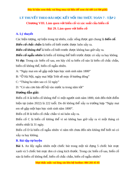 Đây là bản xem th , vu ử i lòng mua tài li u ệ đ xe ể m chi ti t (c ế ó l i ờ gi i ả ) LÝ THUY T Ế THEO BÀI H C Ọ K T Ế N I Ố TRI TH C Ứ TOÁN 7 - T P Ậ 2 Chư ng ơ VIII. Làm quen v i ớ bi n c ế và xác s ố u t ấ c a bi ủ n c ế ố Bài 29. Làm quen v i ớ bi n c ế ố A. Lý thuy t ế Các hi n t ệ ư ng, s ợ ự ki n t ệ rong t nhi ự ên, cu c ộ s ng đ ố ư c ợ g i