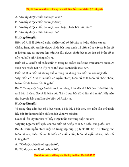 Đây là bản xem th , vu ử i lòng mua tài li u ệ đ xe ể m chi ti t (c ế ó l i ờ gi i ả ) A. “An lấy đư c ợ chi c bút ế m c xanh”; ự B. “An lấy đư c chi ợ c ế bút m c đen”; ự C. “An lấy đư c chi ợ c ế bút m c xanh ho ự c ặ chi c bút ế m c đen”; ự D. “An lấy đư c ợ chi c bút ế m c đ ự ”. ỏ Hư ng d ớ ẫn gi i ả Bi n ế cố A, B là bi n ế c ng ố u nhi ẫ ên vì nó có th x ể y ả ra ho c không x ặ y ả ra. Ch ng ẳ h n, ạ n u ế An l y ấ đư c ợ chi c ế bút m c ự xanh thì bi n ế cố A x y ả ra, bi n ế cố B không x y ả ra, ngư c ợ l i ạ n u ế An l y ấ đư c ợ chi c ế bút m c ự đen thì bi n ế cố B x y ả ra, bi n ế cố A không x y ả ra. Bi n ế cố C là bi n ế c ch ố c ắ ch n