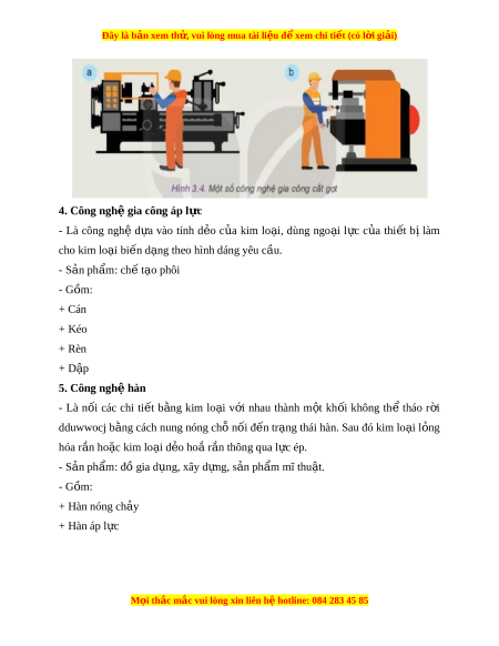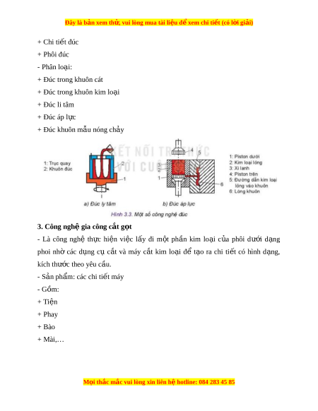 Đây là bản xem th , vu ử i lòng mua tài li u ệ đ xe ể m chi ti t (c ế ó l i ờ gi i ả ) 4. Công ngh gi ệ a công áp l c ự - Là công nghệ d a ự vào tính d o ẻ c a ủ kim lo i ạ , dùng ngo i ạ l c ự c a ủ thi t ế bị làm cho kim lo i ạ bi n d ế ng t ạ heo hình dáng yêu c u. ầ - S n ph ả ẩm: ch t ế o ạ phôi - Gồm: + Cán + Kéo + Rèn + D p ậ 5. Công ngh hàn ệ - Là n i ố các chi ti t ế b ng ằ kim lo i ạ v i ớ nhau thành m t ộ kh i ố không th ể tháo r i ờ dduwwocj b ng cách ằ nung nóng chỗ nối đ n t ế r ng t ạ hái hàn. Sau đó kim lo i ạ l ng ỏ hóa r n ắ ho c ki ặ m lo i ạ d o ho ẻ ắ r n t ắ hông qua l c ép. ự - S n ph ả ẩm: đồ gia d ng, xây d ụ ng, s ự n ph ả m ẩ mĩ thu t ậ . - Gồm: + Hàn nóng ch y ả + Hàn áp l c ự M i