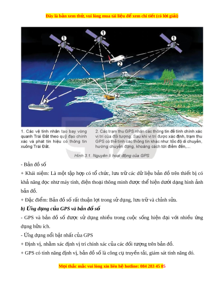 Đây là bản xem th , vu ử i lòng mua tài li u ệ đ xe ể m chi ti t ế (có l i ờ gi i ả ) - B n ả đ s ồ ố + Khái ni m ệ : Là m t ộ t p ậ h p ợ có tổ ch c, ứ l u ư trữ các dữ li u ệ b n ả đ ồ trên thi t ế b ịcó khả năng đ c ọ nh ư máy tính, đi n ệ tho i ạ thông minh đư c ợ th ể hi n d ệ ư i ớ d ng ạ hình nh ả b n ả đồ. + Đ c ặ đi m ể : B n ả đ s ồ ố r t ấ thu n l ậ i ợ trong s d ử ng, l ụ u t ư r và ữ ch nh s ỉ a. ử b) ng d Ứ ng c ụ a G ủ PS và b n đ ả s ồ ố - GPS và b n ả đồ số đư c ợ sử d ng ụ nhi u ề trong cu c ộ s ng ố hi n ệ đ i ạ v i ớ nhi u ề ng ứ d ng h ụ u ữ ích. - ng d Ứ ng n ụ ổi b t ậ nh t ấ c a G ủ PS + Định vị, nh m ằ xác đ nh v ị t ị rí chính xác c a các ủ đ i ố tư ng ợ trên b n ả đ . ồ + GPS có tính năng đ nh v ị , b ị n đ ả s ồ l ố à công cụ truy n t ề i