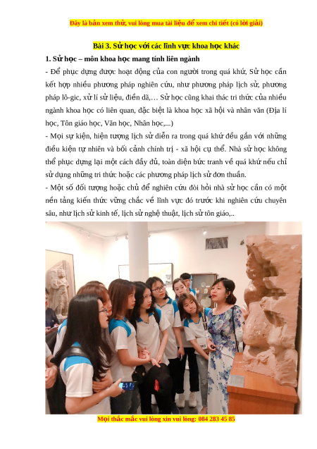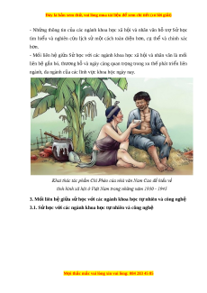 ớ các lĩnh v c khoa h ự c khác ọ 1. Sử h c ọ – môn khoa h c m ọ ang tính liên ngành - Để ph c ụ d ng ự đư c ợ ho t ạ đ ng ộ c a ủ con ngư i ờ trong quá kh , ứ Sử h c ọ c n ầ k t ế h p ợ nhi u ề phư ng ơ pháp nghiên c u, ứ như phư ng ơ pháp l ch ị s , ử phư ng ơ pháp lô-gic, x ử lí sử li u, ệ đi n ề dã,… S ử h c ọ cũng khai thác tri th c ứ c a ủ nhi u ề ngành khoa h c ọ có liên quan, đ c ặ bi t ệ là khoa h c ọ xã h i ộ và nhân văn (Đ a ị lí h c, ọ Tôn giáo h c, ọ Văn h c, ọ Nhân h c,...) ọ - M i ọ sự ki n, ệ hi n ệ tư ng ợ l ch ị sử di n ễ ra trong quá khứ đ u ề g n ắ v i ớ nh ng ữ đi u ề ki n ệ tự nhiên và b i ố c nh ả chính trị - xã h i ộ cụ th . ể Nhà sử h c ọ không thể ph c ụ d ng ự l i ạ m t ộ cách đ y ầ đ , ủ toàn di n ệ b c ứ tranh về quá kh ứ n u ế chỉ s d ử ng ụ nh ng t ữ ri th c ho ứ ặc các phư ng pháp l ơ ch s ị ử đ n t ơ hu n. ầ - M t ộ số đ i ố tư ng ợ ho c ặ chủ để nghiên c u ứ đòi h i ỏ nhà sử h c ọ c n ầ có m t ộ n n ề t ng ả ki n ế th c ứ v ng ữ ch c ắ về lĩnh v c ự đó trư c ớ khi nghiên c u ứ chuyên sâu, như lịch s ki ử nh t , l ế ịch sử nghệ thu t ậ , lịch s t ử ôn giáo,.. M i