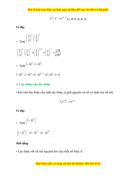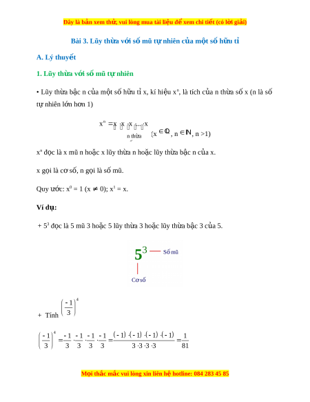 Đây là bản xem th , vu ử i lòng mua tài li u ệ đ xe ể m chi ti t (c ế ó l i ờ gi i ả ) Bài 3. Lũy th a v ừ i ớ s m ố ũ t n ự hiên c a m ủ t ộ số hữu tỉ A. Lý thuy t ế 1. Lũy th a v ừ i ớ số mũ t n ự hiên • Lũy th a ừ b c ậ n c a ủ m t ộ s ố h u ữ t ỉx, kí hi u ệ xn, là tích c a ủ n th a ừ số x (n là số t nhi ự ên l n ớ h n 1 ơ ) n x x x x .. . x