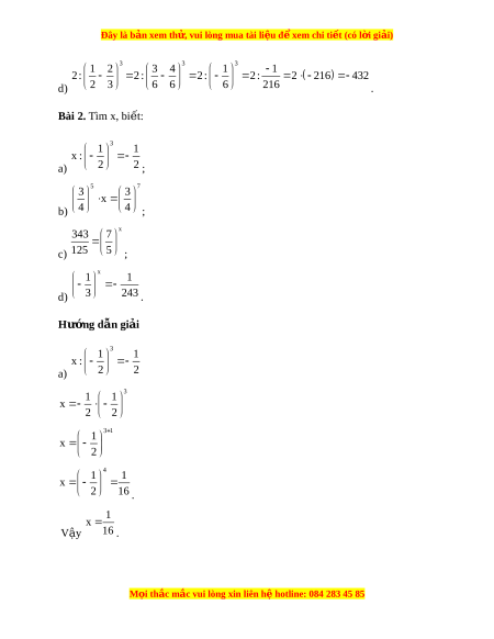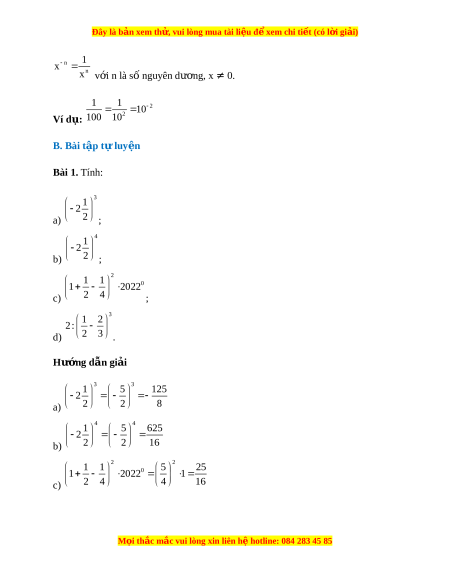 Đây là bản xem th , vu ử i lòng mua tài li u ệ đ xe ể m chi ti t (c ế ó l i ờ gi i ả ) n 1 x n x v i ớ n là số nguyên dư ng, ơ x ≠ 0. 1 1 2 10 Ví d : ụ 2 100 10 B. Bài t p t ậ l ự uy n ệ Bài 1. Tính: 3 1 2 a) 2 ; 4 1 2 b) 2 ; 2 1 1 0 1 20 22 c) 2 4 ; 3 1 2 2 : d) 2 3 . Hư ng d ớ ẫn gi i ả 3 3 1 5 125 2 a) 2 2 8 4 4 1 5 625 2 b) 2 2 16 2 2 1 1 5 25 0 1 20 22 1 c) 2 4 4 16 M i