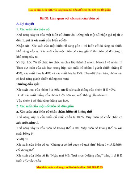 Đây là bản xem th , vu ử i lòng mua tài li u ệ đ xe ể m chi ti t (c ế ó l i ờ gi i ả ) Bài 30. Làm quen v i ớ xác su t ấ c a bi ủ n c ế ố A. Lý thuy t ế 1. Xác su t ấ c a bi ủ n c ế ố Khả năng x y ả ra c a ủ m t ộ bi n ế cố đư c ợ đo lư ng ờ b i ở m t ộ số nh n ậ giá trị từ 0 đ n 1, g ế i
