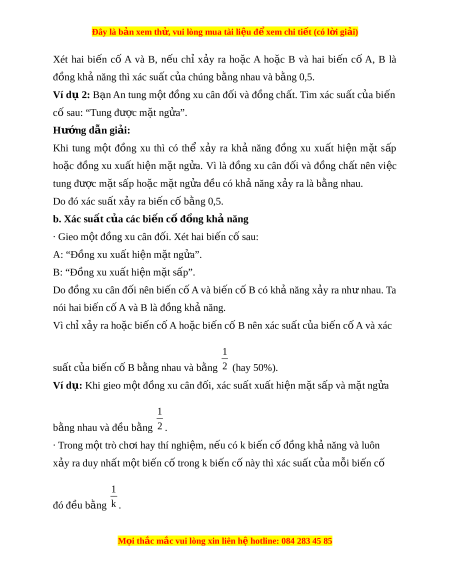 Đây là bản xem th , vu ử i lòng mua tài li u ệ đ xe ể m chi ti t (c ế ó l i ờ gi i ả ) Xét hai bi n ế cố A và B, n u ế chỉ x y ả ra ho c ặ A ho c ặ B và hai bi n ế cố A, B là đồng kh năng ả thì xác su t ấ c a chúng ủ b ng nhau và b ằ ng ằ 0,5. Ví d 2 ụ : B n ạ An tung m t ộ đ ng xu cân ồ đ i ố và đ ng ch ồ t ấ . Tìm xác su t ấ c a ủ bi n ế cố sau: “Tung được m t ặ ng a”. ử Hư ng d ớ ẫn gi i ả : Khi tung m t ộ đ ng ồ xu thì có thể x y ả ra khả năng đ ng ồ xu xu t ấ hi n ệ m t ặ s p ấ ho c ặ đ ng ồ xu xu t ấ hi n ệ m t ặ ng a. ử Vì là đ ng ồ xu cân đ i ố và đ ng ồ ch t ấ nên vi c ệ tung đư c ợ m t ặ s p ho ấ ặc m t ặ ng a ử đ u có kh ề năng x ả y r ả a là b ng ằ nhau. Do đó xác suất x y r ả a bi n c ế b ố ng ằ 0,5.