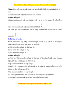 ế thẻ ghi các số 5; 6; 7; 8; 9; 11. Rút ng u ẫ nhiên m t ộ tấm th t ẻ rong h p. ộ Tính xác su t ấ đ : ể a) Rút đư c ợ t m ấ th ghi ẻ s nh ố ỏ h n 12; ơ b) Rút đư c ợ t m ấ th ghi ẻ s 10; ố c) Rút đư c ợ t m ấ th ghi ẻ s 7. ố Hư ng d ớ ẫn gi i ả a) Bi n ế c : ố “Rút đư c ợ t m ấ th ẻ ghi số nh ỏ h n ơ 12” là bi n ế c ch ố c ắ ch n ắ vì trong h p ộ c 6 t ả ấm th đ ẻ u ghi ề s nh ố h ỏ n 12. ơ V y ậ xác suất c a ủ bi n c ế ố này b ng 1. ằ b) Bi n ế c : ố “Rút đư c ợ t m