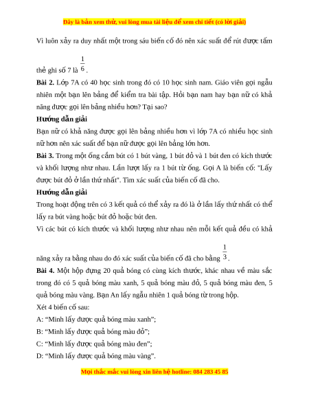 Đây là bản xem th , vu ử i lòng mua tài li u ệ đ xe ể m chi ti t (c ế ó l i ờ gi i ả ) Vì luôn x y ả ra duy nh t ấ m t ộ trong sáu bi n ế c ố đó nên xác su t ấ đ ể rút đư c ợ t m ấ 1 thẻ ghi số 7 là 6 . Bài 2. L p ớ 7A có 40 h c ọ sinh trong đó có 10 h c ọ sinh nam. Giáo viên g i ọ ng u ẫ nhiên m t ộ b n ạ lên b ng ả để ki m ể tra bài t p. ậ H i ỏ b n ạ nam hay b n ạ nữ có khả năng được g i ọ lên b ng ả nhi u h ề n? ơ T i ạ sao? Hư ng d ớ ẫn gi i ả B n