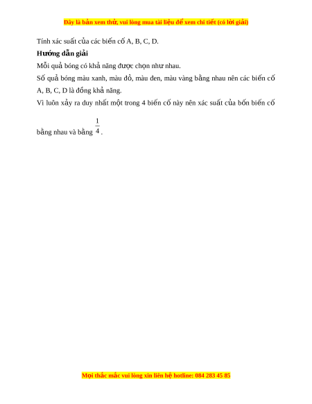 Đây là bản xem th , vu ử i lòng mua tài li u ệ đ xe ể m chi ti t (c ế ó l i ờ gi i ả ) Ví d : ụ Gieo m t ộ con xúc x c ắ đư c ch ợ t ế o ạ cân đ i ố . Tính xác su t ấ c a ủ bi n c ế ố sau: A: “Số chấm xu t ấ hi n t ệ rên m t ặ con xúc x c l ắ à 6”. Hư ng d ớ ẫn gi i ả : Khi gieo m t ộ con xúc x c ắ cân đ i ố thì 6 m t ặ c a ủ nó có kh ả năng xu t ấ hi n ệ b ng ằ 1 nhau nên xác suất xu t ấ hi n c ệ a m ủ ỗi m t ặ đ u l ề à 6 . Do 6 k t ế quả đ u ề có khả năng x y ả ra b ng ằ nhau nên xác su t ấ c a ủ bi n ế cố đã 1 cho b ng ằ 6 . B. Bài t p t ậ l ự uy n ệ Bài 1. M t ộ chi c ế h p ộ đ ng ự 6 chi c