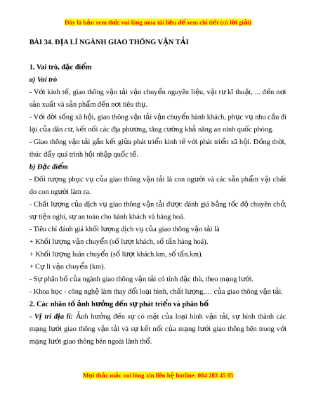 1. Vai trò, đặc đi m ể a) Vai trò - V i ớ kinh t , ế giao thông v n ậ t i ả v n ậ chuy n ể nguyên li u, ệ v t ậ t ư kĩ thu t ậ , ... đ n ế n i ơ s n ả xuất và s n ả ph m ẩ đ n n ế i ơ tiêu th . ụ - V i ớ đ i ờ s ng ố xã h i ộ , giao thông v n ậ t i ả v n ậ chuy n ể hành khách, ph c ụ v ụ nhu c u ầ đi l i ạ c a dân c ủ , ư k t ế nối các đ a ph ị ư ng, t ơ ăng cư ng ờ kh năng an ả ninh qu c phòng. ố - Giao thông v n ậ t i ả g n ắ k t ế gi a ữ phát tri n ể kinh t ế v i ớ phát tri n ể xã h i ộ . Đ ng ồ th i ờ , thúc đẩy quá trình h i ộ nh p qu ậ c t ố . ế b) Đặc đi m ể - Đối tư ng ợ ph c ụ vụ c a ủ giao thông v n ậ t i ả là con ngư i ờ và các s n ả ph m ẩ v t ậ ch t ấ do con ngư i ờ làm ra. - Ch t ấ lư ng ợ c a ủ d ch ị vụ giao thông v n ậ t i ả đư c ợ đánh giá b ng ằ t c ố đ ộ chuyên ch , ở sự tiện nghi, s an t ự