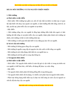 Ờ G VÀ TÀI NGUYÊN THIÊN NHIÊN 1. Môi trư ng ờ a) Khái ni m ệ và đ c đi ặ m ể - Khái ni m ệ : Môi trư ng ờ bao g m ồ các y u ế tố v t ậ ch t ấ tự nhiên và nhân t o ạ có quan hệ m t ậ thi t ế v i ớ nhau, bao quanh con ngư i ờ , có nh ả hư ng ở đ n ế đ i ờ s ng, ố kinh t , ế xã h i ộ , sự tồn t i ạ , phát tri n c ể a con ng ủ ư i ờ và t nhi ự ên. - Đ c ặ đi m ể + Môi trư ng ờ s ng ố c a ủ con ngư i ờ là t ng ổ h p ợ nh ng ữ đi u ề ki n ệ bên ngoài có nh ả hư ng ở t i ớ đ i ờ s ng ố và sự phát tri n ể c a ủ con ngư i ờ , đư c ợ phân thành môi trư ng ờ tự nhiên, môi trư ng xã h ờ i ộ và môi trư ng nhân ờ t o. ạ + Môi trư ng ờ có mối quan h m ệ t ậ thi t ế và tác đ ng qua l ộ i ạ v i ớ con ngư i ờ .