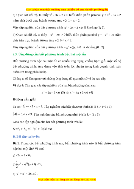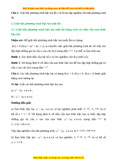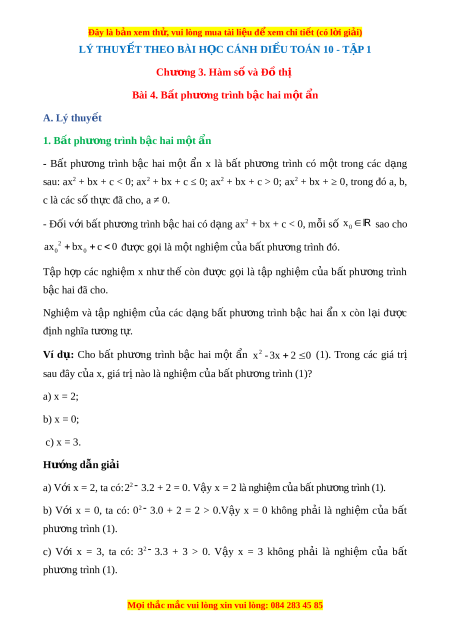 Đây là bản xem th , vu ử i lòng mua tài li u ệ đ xe ể m chi ti t ế (có l i ờ gi i ả ) LÝ THUY T Ế THEO BÀI H C Ọ CÁNH DI U Ề TOÁN 10 - T P Ậ 1 Chư ng 3. H ơ àm số và Đ t ồ h ị Bài 4. B t ấ phư ng t ơ rình b c hai ậ m t ộ n ẩ A. Lý thuy t ế 1. Bất phư ng ơ trình b c hai ậ m t ộ n ẩ - Bất phư ng ơ trình b c ậ hai m t ộ n ẩ x là b t ấ phư ng ơ trình có m t ộ trong các d ng ạ