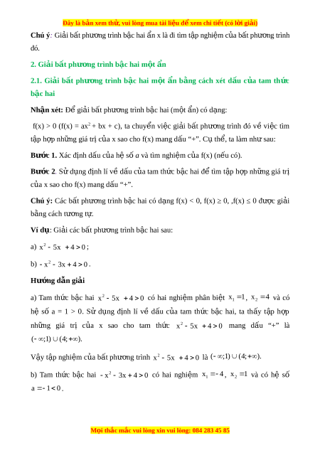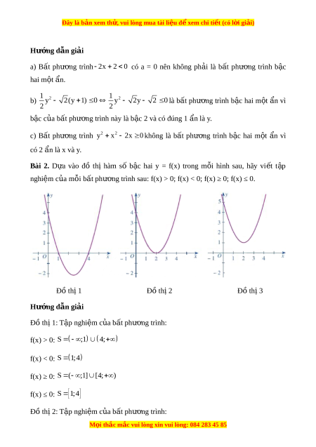 Đây là bản xem th , vu ử i lòng mua tài li u ệ đ xe ể m chi ti t ế (có l i ờ gi i ả ) Chú ý: Gi i ả b t ấ phư n ơ g trình b c ậ hai n ẩ x là đi tìm t p ậ nghi m ệ c a ủ b t ấ phư n ơ g trình đó. 2. Giải bất phư ng ơ trình b c ha ậ i m t ộ n ẩ 2.1. Gi i ả b t ấ phư ng ơ trình b c ậ hai m t ộ n ẩ b ng ằ cách xét d u ấ c a ủ tam th c ứ bậc hai Nhận xét: Để gi i ả b t ấ phư ng t ơ rình b c ậ hai (m t ộ n ẩ ) có d ng: ạ