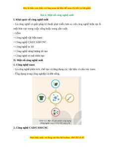 I. Khái quát v công ng ề h m ệ i ớ - Là công nghệ có gi i ả pháp kĩ thu t ậ phát tri n ể h n ơ so v i ớ công ngh ệ hi n ệ t i ạ ở m t ộ lĩnh v c ự trong cu c ộ s ng ho ố c t ặ rong s n ả xu t ấ . - Gồm: + Công ngh v ệ t ậ li u nano ệ + Công ngh C ệ AD/CAM/CNC + Công ngh i ệ n 3D + Công ngh năng ệ lư ng t ợ ái t o ạ + Công ngh t ệ rí tu nhân t ệ o ạ II. M t ộ s công ngh ố m ệ i ớ 1. Công ngh nano ệ - Là công ngh phân t ệ ích, ch t ế o và ạ ng d ứ ng các v ụ t ậ li u có c ệ u t ấ rúc nano. - ng d Ứ ng t ụ rong công nghi p và ệ đ i ờ s ng. ố 2. Công ngh C ệ AD/CAM/CNC M i