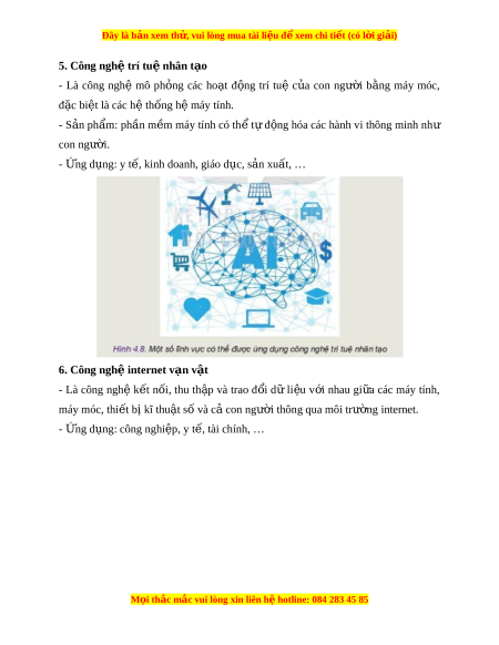 Đây là bản xem th , vu ử i lòng mua tài li u ệ đ xe ể m chi ti t (c ế ó l i ờ gi i ả ) 5. Công ngh t ệ rí tu nhân t ệ o ạ - Là công nghệ mô ph ng ỏ các ho t ạ đ ng ộ trí tuệ c a ủ con ngư i ờ b ng ằ máy móc, đ c ặ bi t ệ là các hệ thống h m ệ áy tính. - S n ả ph m ẩ : ph n ầ m m ề máy tính có th ể t ự đ ng