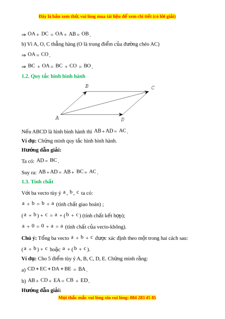 Đây là bản xem th , vu ử i lòng mua tài li u ệ đ xe ể m chi ti t (c ế ó l i ờ gi i ả ) ⇒ OA + DC = OA + AB = OB . b) Vì A, O, C th ng ẳ hàng (O là trung đi m ể c a ủ đư ng chéo ờ AC) ⇒ OA = CO . ⇒ BC + OA = BC + CO = BO .