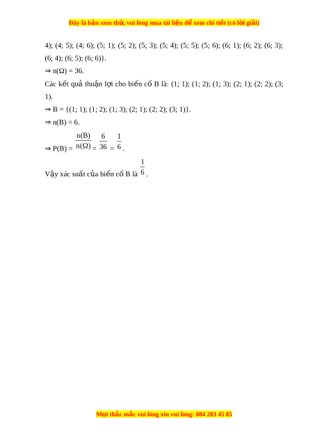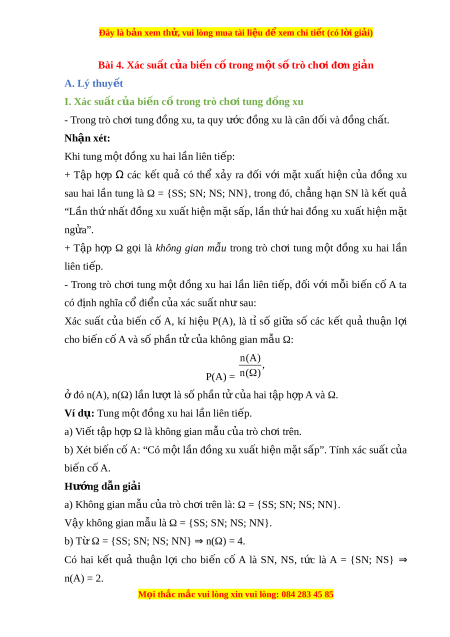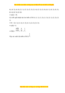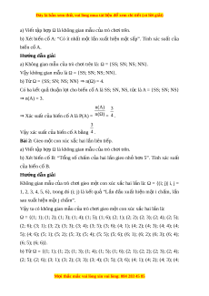 Đây là bản xem th , vu ử i lòng mua tài li u ệ đ xe ể m chi ti t (c ế ó l i ờ gi i ả ) a) Vi t ế t p ậ h p Ω l ợ à không gian m u c ẫ a t ủ rò ch i ơ trên. b) Xét bi n ế cố A: “Có ít nh t ấ m t ộ l n ầ xu t ấ hi n ệ m t ặ s p”. ấ Tính xác su t ấ c a ủ bi n c ế ố A. Hư ng d ớ ẫn gi i ả a) Không gian mẫu c a t ủ rò ch i