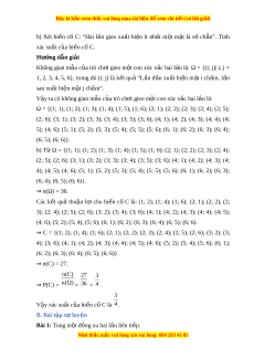ơ trên là: Ω = {SS; SN; NS; NN}. V y ậ không gian m u l ẫ à Ω = {SS; SN; NS; NN}. b) T Ω = {SS; ừ SN; NS; NN} ⇒ n(Ω) = 4. Có ba k t ế qu t ả hu n ậ l i ợ cho bi n ế c ố A là SS; SN, NS, t c ứ là A = {SS; SN; NS} ⇒ n(A) = 3. n(A) 3 ⇒ Xác suất c a ủ bi n c ế ố A là P(A) = n() = 4 . 3 V y ậ xác suất c a ủ bi n c ế ố A b ng ằ 4 . Bài 2: Gieo m t ộ con xúc x c ắ hai l n l ầ iên ti p. ế a) Vi t ế t p ậ h p Ω l ợ à không gian m u c ẫ a t ủ rò ch i ơ trên. b) Xét bi n ế cố B: “T ng ổ số ch m ấ c a ủ hai l n ầ gieo nh ỏ h n ơ 5”. Tính xác su t ấ c a ủ bi n c ế ố B. Hư ng d ớ ẫn gi i ả Không gian m u ẫ c a ủ trò ch i ơ gieo m t ộ con xúc x c ắ hai l n ầ là: Ω = {(i; j)| i, j =