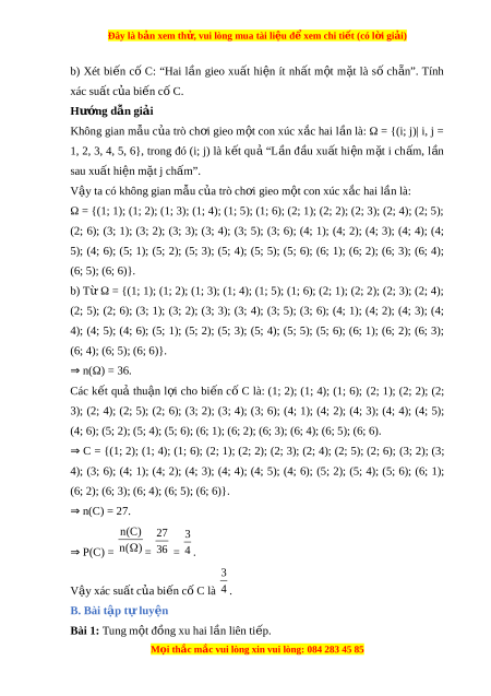 Đây là bản xem th , vu ử i lòng mua tài li u ệ đ xe ể m chi ti t ế (có l i ờ gi i ả ) b) Xét bi n ế cố C: “Hai l n ầ gieo xu t ấ hi n ệ ít nh t ấ m t ộ m t ặ là số ch n”. ẵ Tính xác suất c a ủ bi n c ế ố C. Hư ng ớ d n gi ẫ i ả Không gian m u ẫ c a ủ trò ch i ơ gieo m t ộ con xúc x c ắ hai l n ầ là: Ω = {(i; j)| i, j =