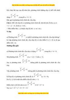 Đây là bản xem th , vu ử i lòng mua tài li u ệ đ xe ể m chi ti t (c ế ó l i ờ gi i ả ) Khi ch n ọ hệ tr c ụ t a ọ độ như trên, phư ng ơ trình đư ng ờ elip có thể vi t ế dư i ớ 2 2 x y 1 d ng ạ 2 2 a b , trong đó a > b > 0. Đây g i ọ là phư ng t ơ rình chính t c c ắ a ủ elip. Chú ý: Đ i ố v i ớ elip (E) có phư ng ơ trình chính t c ắ nh đã nêu ư t ở rên, ta có: + c2 = a2 – b2, đó 2c = F ở 1F2. + N u đi ế m ể M(x ; y) thu c el ộ ip (E) thì –a ≤ x ≤ a. Ví d : ụ 2 2 x y 1 a) Phư ng t ơ rình 2 2 3 5 có ph i ả là phư ng ơ trình chính t c ắ c a el ủ ip không? b) L p ậ phư ng ơ trình chính t c ắ c a ủ elip (E) có tiêu đi m ể F1(–3 ; 0) và đi qua đi m ể A(0 ; 2). Hư ng d ớ ẫn gi i ả 2 2 x y 1 a) Phư ng t ơ rình chính t c c ắ a ủ elip có d ng ạ 2 2 a b , trong đó a > b > 0. 2 2 x y 1 Mà phư ng t ơ rình 2 2 3 5